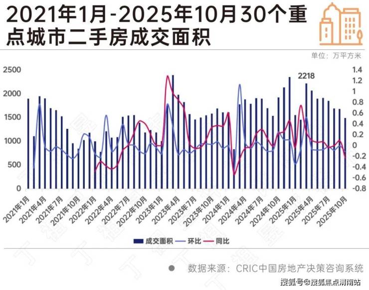 2025年10月30个重点城市二手房成交面积1469万平方米,环比下降12%。