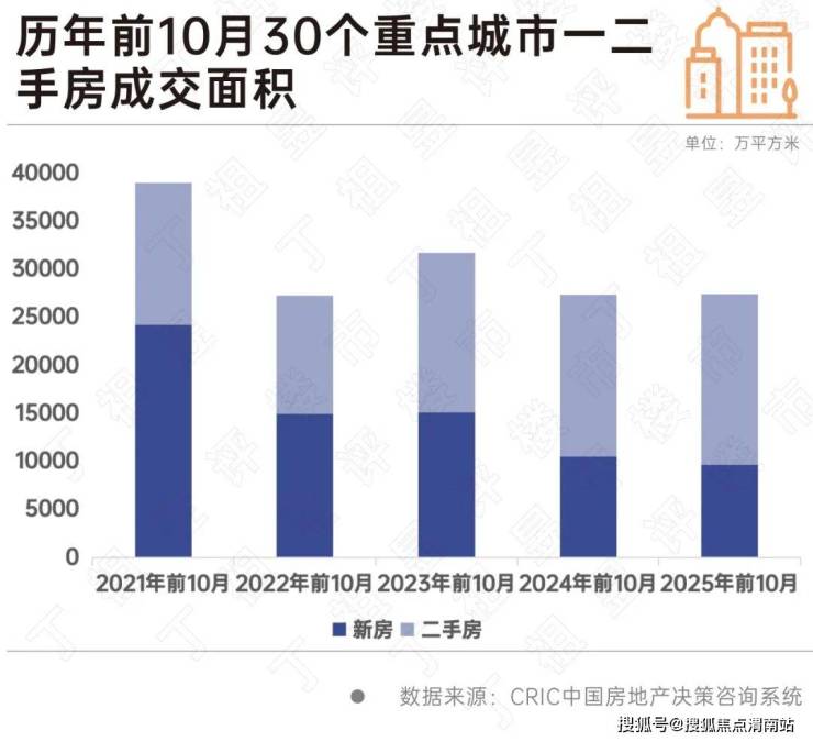 2025年前10月,30个重点城市一二手房成交面积27443万平方米,较2024年同期持平。其中新房同比下降7%、二手房同比上涨6%。