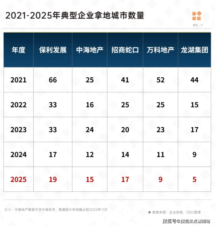 数据显示,2020年以前企业为追求规模,布局城市快速扩张,以保利发展、中海地产为典型的头部房企,2016-2020年新进城市数量占累计进驻城市的比重均在四成以上,但2021年以来,布局城市快速收缩,其中保利发展拿地城市数量从2021年的66个城市减少至2025年的19个;这期间,中海地产也由25个城市,减少至15个。