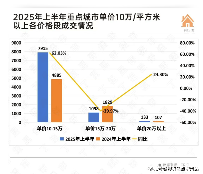 从各单价段来看,单价10万元-15万元/平方米和单价20万元/平方米以上顶豪成交同比均上涨,其中单价10万元-15万元/平方米高端住宅成交了7915套,同比增长62%;单价20万元/平方米以上顶豪共成交了133套,同比增长24%。