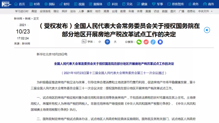 10月23日,全国人大常委会授权国务院,在部分地区开展房地产税改革试点工作。