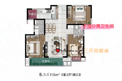三、细节化处理到位。在113㎡户型中,我们不难发现一些居家生活的细节要素,比如公卫做到了干湿分离,巧妙的解决了不同场景共用卫生间的问题,且位置布局合理,位于次卧和客卧之间,避免了市面上有些户型需要“穿堂”才能到卫生间的困扰,大大便利了居家生活。