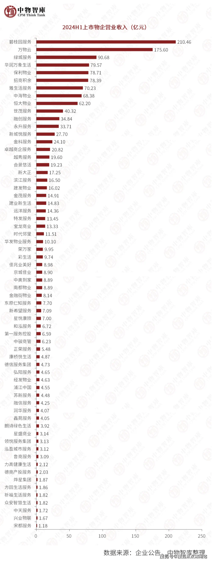 其中,营收超百亿元的上市物企仅有碧桂园服务、万物云两家,分别为210.46亿元、175.6亿元;有7家物企营收超50亿元,14家物企营收在均值22.81亿元以上。