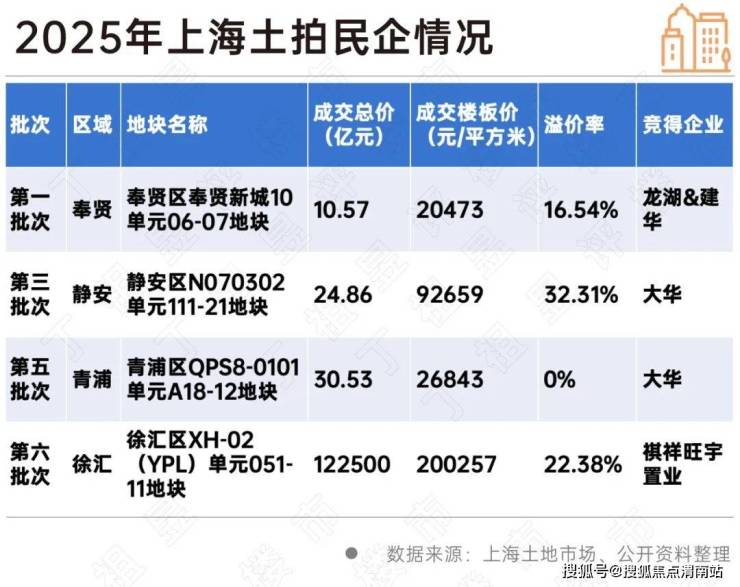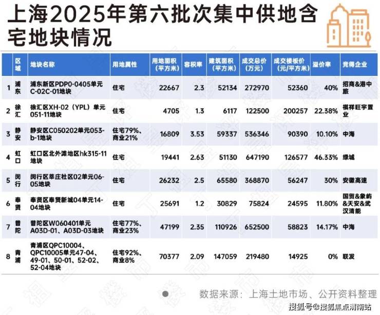 2025年7月24-25日上海举行第六批次土拍,第一天共成交了5宗地块,第二天成交了3宗,两日共揽金290亿元,平均溢价率达22.33%。