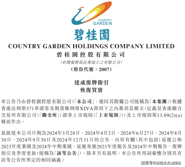 根据公告,由于碧桂园无法按时披露2023年度业绩,公司股份自2024年4月2日上午9时于香港联交所暂停买卖。今年1月14日,碧桂园发布了2023年年报及2024年中报。