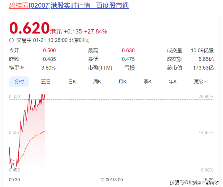 1月21日,停牌9个多月的碧桂园(HK02007,股价0.620港元,市值173.53亿港元)正式复牌,股价一度上涨近30%。截至发稿,碧桂园股价报0.620港元,涨幅为27.84%。
