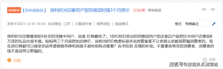 澎湃新闻在苏州阳光便民网上看到,12月1日,有网友留言表示:苏州高新区保利时光印象雅苑项目,“8月份买的顶楼中间户,说是价格最低了。10月30日卖出的同楼层同户型还是边户,居然比中间户还便宜6万元,送的礼品也很丰盛。短短两三个月居然如此降价,说明当时价格虚标。”
