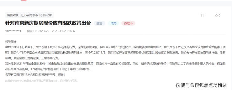 在领导留言板上,11月23日,有网友表示“针对南京新房期房降价应有限跌政策出台”。该网友留言道,“房地产经济下行趋势下,房产价格下跌是市场选择的行为,这我们都能理解,但是当初房价上涨过快时,政府能够及时出面制止,那么房价下跌过快是否也应该有相应政策能够干预呢?我是今年8月于南京市栖霞区西岗街道泷悦雅颂购房的业主,3个月后的11月,我们得知开发商已经在备案价格基础上降价接近20%出售。我们去与开发商协商沟通补偿并没有成功,原因是他们觉得这属于正常市场行为。 我关注到从21年开始全国有20多个城市陆陆续续在出台商品房限跌政策,而南京市一直没有相关政策。同时,新房的过度快速降价,导致周边二手房市场受到更大的冲击,例如我小区总高26层的房,17层中间户价格甚至低于周边十年前二手房价格。”