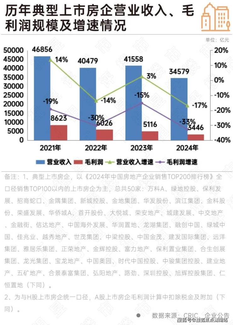 聚焦到房地产行业来看,据克而瑞研究中心对50家上市房企2024年财报数据的整理,2024年行业典型上市房企整体营收与利润出现了双降,2024年行业典型上市房企整体的毛利率为10%,同比下降2个百分点。