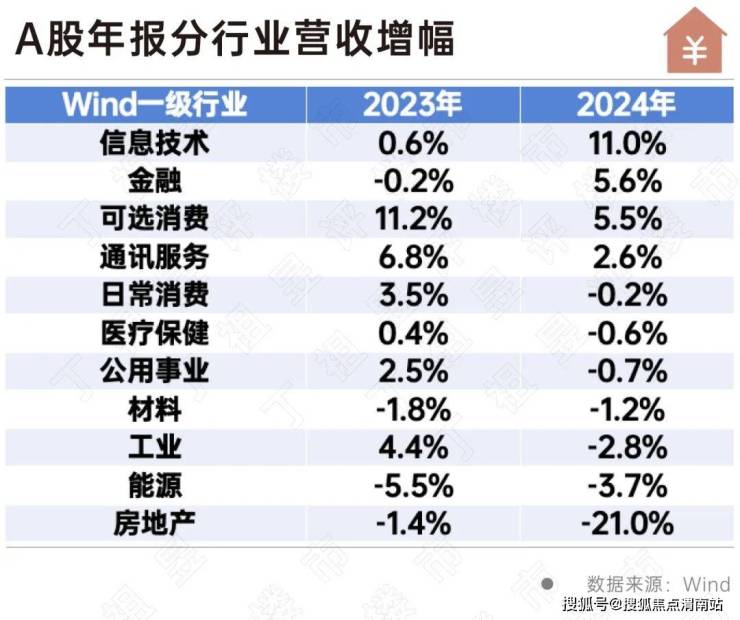 分行业来看,不同行业业绩分化显著。其中信息技术板块营收增强,2024年增长达11%位居首位,房地产行业延续低迷,营收增幅以-21%垫底。