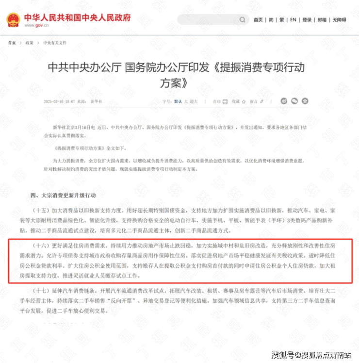 3月16日消息,中共中央办公厅、国务院办公厅印发《提振消费专项行动方案》,其中提到持续用力推动房地产市场止跌回稳,充分释放刚性和改善性住房需求潜力。