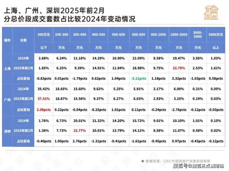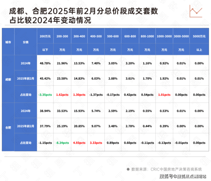 合肥则主要依托于高改支撑,据CRIC监测数据,合肥2025年前2月总价300-500万成交占比3成且涨幅达8.26个百分点。同样,总价段200-300万成交跌幅较为显著。