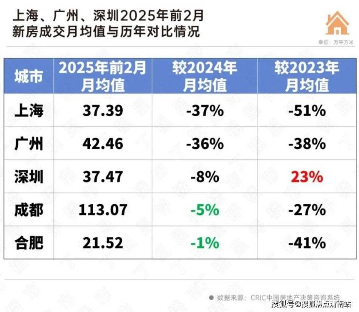 值得注意的是,二线城市合肥和成都前2月成交月均值较2024年全年月均值降幅均在5%以内,释放筑底企稳的积极信号。