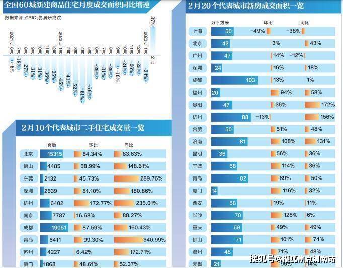 市场的回暖也反馈至数据层面。整体来看,2月份全国重点城市新房交易行情出现积极信号,在经历持续20个月交易数据的下降压力下,首次逆势崛起。来自易居研究院的统计显示,2月份,全国60个重点城市新建商品住宅成交面积2005万平方米,环比增长47%,同比增长37%。分城市来看,2月全国60个一、二、三四线城市,新建商品住宅成交面积分别为163万平方米、1020万平方米、822万平方米,环比增速分别为-18%、49%和70%,同比增速分别为-11%、40%和49%。