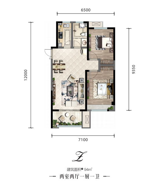 约94㎡两室两厅一卫,以5500元/㎡价格,35%的首付来算,首付约18万,月供约1784元。
