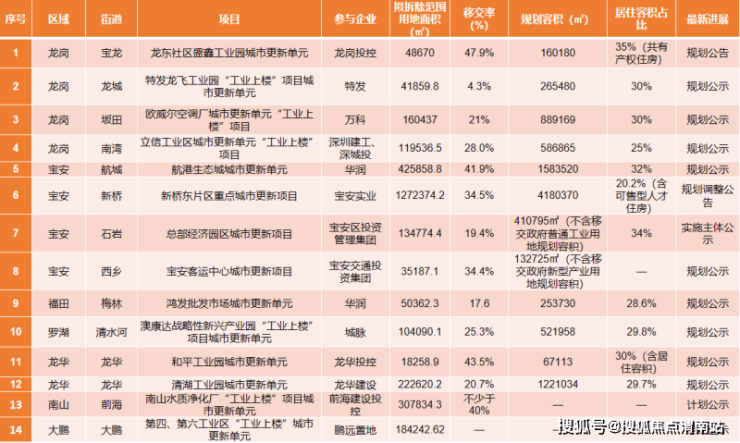 来自合一城市更新研究院的统计显示,截至10月份,深圳共有14个城市更新类“工业上楼”项目有了新进展,拟拆除重建范围面积超312.6公顷,总计容建筑面积超1027万平方米。