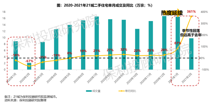 调控收紧的背后,是1-2月淡季“不断档”的一二手楼市。据保利投顾研究院发布的较新二手房报告,2021年1-2月全国21城二手住宅交易双高,累计成交26万宗,创近五年新高。