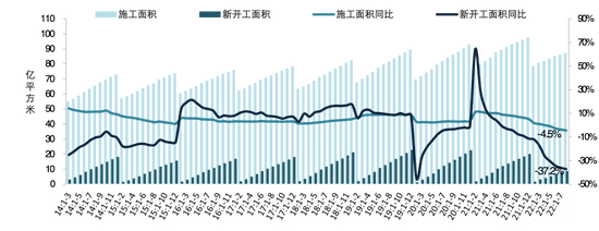 (2014年至今全国房屋累计新开工和施工面积及其同比增速。来源:中指数据CREIS,国家统计局)