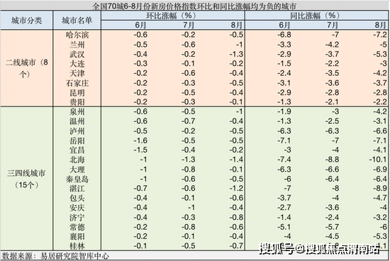 (全国70城6~8月新房价格指数环比和同比涨幅均为负的城市。来源:易居研究院智库中心)