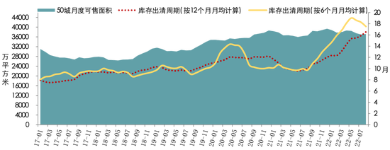 (2017年1月至2022年8月,50个代表城市商品住宅可售面积与出清周期。来源:中指数据CREIS)