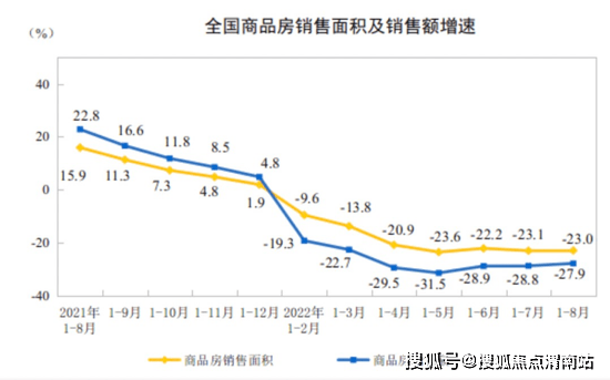 (2021年1月-2022年8月,全国商品房销售面积及销售额增速。来源:国家统计局)