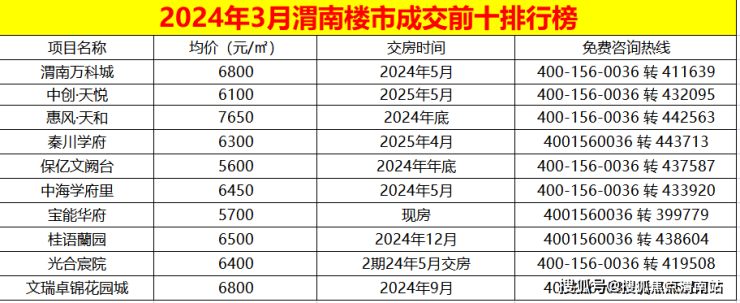 据搜狐焦点渭南站统计,2024年3月渭南新房成交TOP10楼盘分别为:渭南万科城、中创·天悦、惠风·天和、秦川学府、保亿文阙台、中海学府里、宝能华府、桂语蘭园、光合宸院、文瑞卓锦花园城。