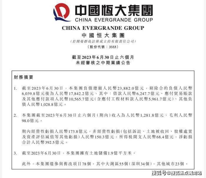 中国恒大2023年中报截图。