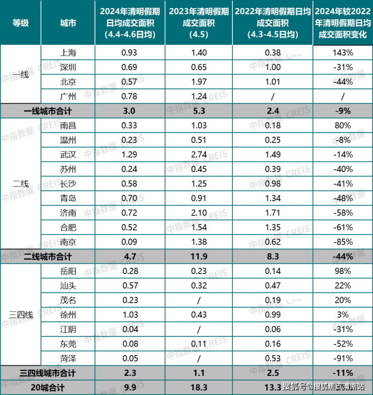 根据中指研究院监测数据,2024年清明假期期间(4月4日-4月6日),20个代表城市新房日均成交面积较2022年假期新房销售面积下降31%。