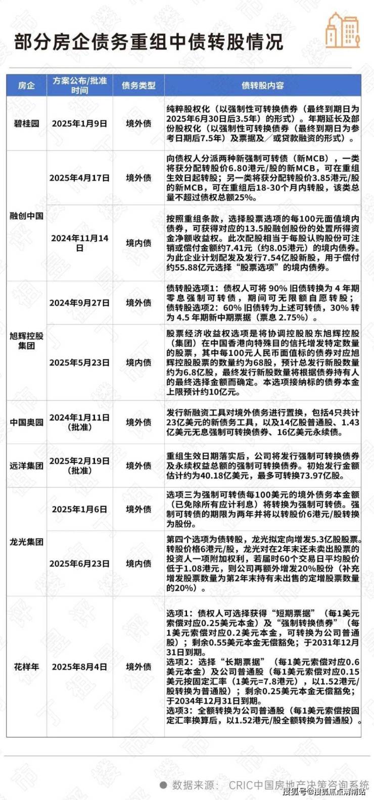 一个典型案例是龙光集团。2025年1月6日龙光集团发布境外债重组方案,其中就包括现金支付、短期票据与强制可转换债券的组合、强制可转换债券、长期票据共计四个选项,其中强制可转债的期限为两年并将以转股价6港元/股转换为股份。
