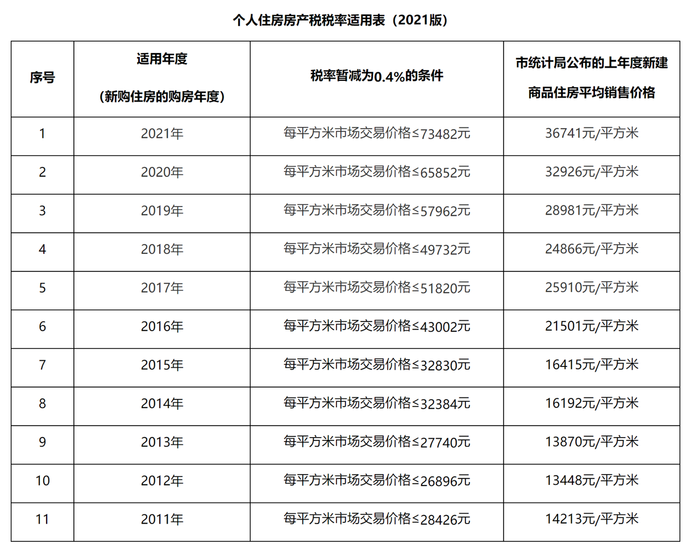 具体而言,2021年上海市统计局公布的上年度新建商品住房平均销售价格为36741元/平方米,按此计算,2021年新购入住房的相关购房者,如果每平方米市场交易价格≤73482元的,税率可暂减为0.4%,否则按照0.6%计算。