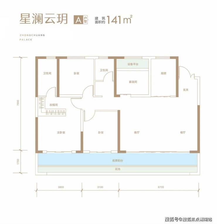 建面约141㎡爆款横厅,客厅开间达6.7米,空间开阔有排面,空间效率最大化利用。虽然有超大横厅,但该产品其他功能区的舒适度并没有削减:主卧套房开间约3.8米,衣帽间空间充裕,带独立明卫并连通阳台,实现了酒店化功能。次卧亦可实现3.1米开间设计。