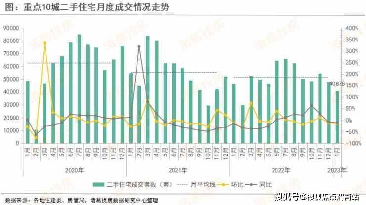 据诸葛找房数据研究中心统计,2023年1月10个重点城市二手住宅成交40878套,环比下降14.85%,同比下降11.6%。进入2023年首月,适逢元旦和春节假期“双节”,加上疫情防控全面放开,大量群体选择旅游过年、探亲访友,购房市场活跃度相对下降,带动本月二手房成交规模回落。虽然1月市场呈现淡季表现,但是春节期间多城二手房带看量等指标表现亮眼,市场回温迹象已现,加上年后郑州、天津、厦门等多城密集下调首套房贷款利率下限,有利于减少购房成本、提升购房者入市积极性,预计接下来市场将会逐步复苏,部分热点城市有望迎来小阳春行情。
