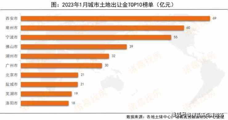 2023年1月城市土地出让金TOP10榜单中,长三角城市土地收金表现相对亮眼,占据半数份额。其中,西安以69亿元位居土地出让金首位,1月西安有10余宗地块接连出让,同时随着西安文旅板块的深度发展,本土房企的布局意愿增强,助力西安土地收金领跑。常州、宁波分别以60亿元、55亿元位居土地出让金第二、三位,2城凭借长三角区域优势,备受房企青睐,收金能力不容小觑。另外注意到,土地出让金TOP10榜单中也有北京、广州2个一线城市的身影,分别实现21亿元、30亿元的土地收金。