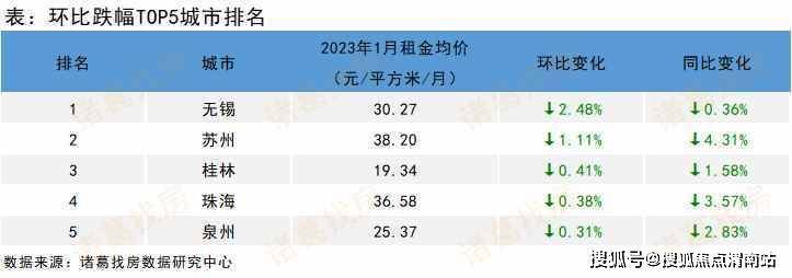 从环比跌幅TOP5城市来看,1月份租金跌幅前5城市分别是无锡、苏州、桂林、珠海、泉州,环比跌幅分别为2.48%、1.11%、0.41%、0.38%、0.31%。另外,该5城的租金均价均较去年同期有所下降,其中,苏州、珠海、泉州3城的租金同比跌幅均超2%。