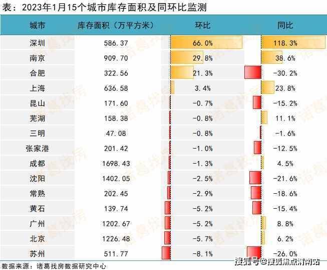从同比数据来看,7城库存面积同比上涨,8城库存面积同比下跌。其中,深圳库存面积同比上涨118.3%,涨幅居首,南京和上海库存面积同比上涨38.6%、23.8%,位居同比涨幅第二、三。合肥和苏州库存面积同比分别下跌30.2%、26%,位居跌幅一、二。