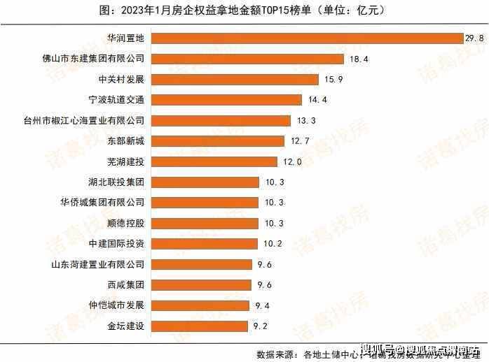 房企拿地金额TOP15榜单中,华润置地位居榜首,总权益拿地金额为29.8亿元,该笔土地投资资金注入了广州荔湾区1宗商办地块。佛山市东建集团有限公司、中关村发展分别以18.4亿元、15.9亿元位居权益拿地金额第二、三位。值得注意的是,地方城投托底现象持续蔓延,于本月权益拿地金额排行榜中,拿地房企主要为本土民企及地方城投两类阵营,且地方城投类企业占比半数以上份额。预计随着各地2023年土拍活动逐步开启,优质头部房企将逐步回归拿地前列。