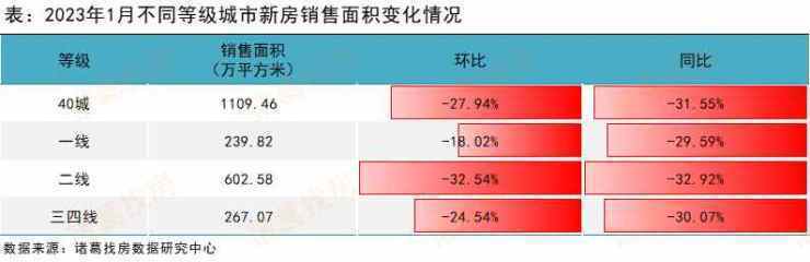 分不同等级城市来看,各等级城市新房成交规模呈现全线下滑态势,且二线城市降幅居首。根据诸葛找房数据研究中心监测数据显示,2023年1月一线城市销售面积为239.82万平方米,环比下降18.02%,同比下降29.59%;二线城市销售面积为602.58万平方米,环比下降32.54%,同比下降32.92%;三四线城市销售面积为267.07万平方米,环比下降24.54%,同比下降30.07%。