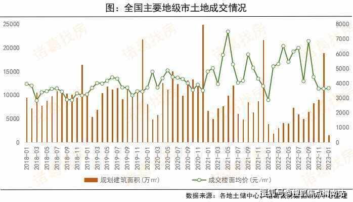 据诸葛找房数据研究中心监测,2023年1月全国主要地级市土地成交251宗,成交规划建筑面积为1538.91万㎡,同比下降60.61%,环比下降91.89%;成交楼面价为3666元/平方米,同比上涨28.05%,环比微涨0.91%;土地出让金为564.22亿元,同比下跌49.59%,环比下跌91.81%。同样2023年首月土地市场中的拍地活动也较少,加之供应端收紧,土地成交规模也呈现明显的回落态势,预计2、3月份成交端可能会缓慢回升。