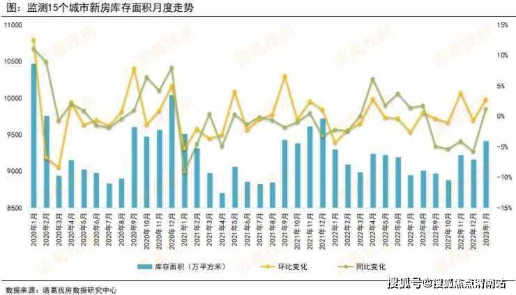 根据数据显示,2023年1月监测15个城市的新房库存面积为9417.28万平方米,环比上升2.79%,同比上升1.22%。在供应端收紧,去化动力不足的背景下,1月新房库存量上升。从具体城市来看,11城库存面积环比下降,且降幅均在10%以下,4城库存量环比上升。其中苏州以8.1%的环比跌幅居首,深圳以66%的环比涨幅居首。