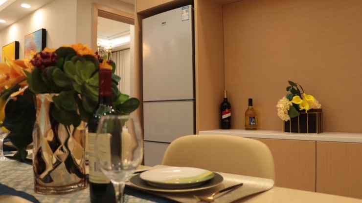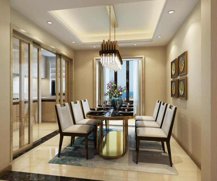 3米奢侈餐厅及厨房餐厅横向设计。超大奢侈的餐厅尺度,可以同时容纳10余人就餐。餐客一体动线流畅,是您节日家宴,朋友聚餐的优质之地。