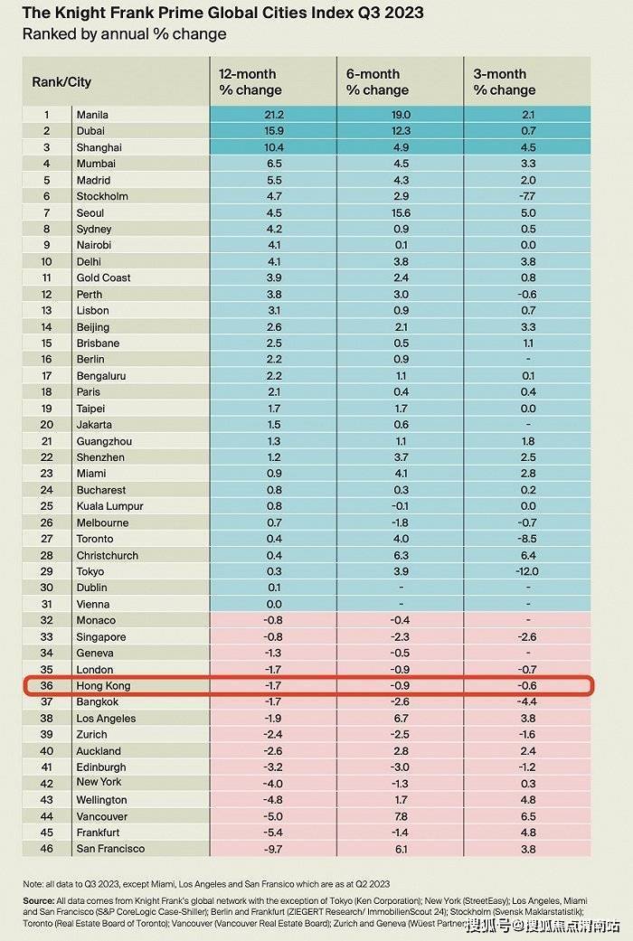 但香港豪宅楼价却在持续下跌,第三季度较二季度楼价按年下跌0.6%;若以截至今年9月底的12个月来算,按年跌幅达到了1.7%,全球排名第36位。
