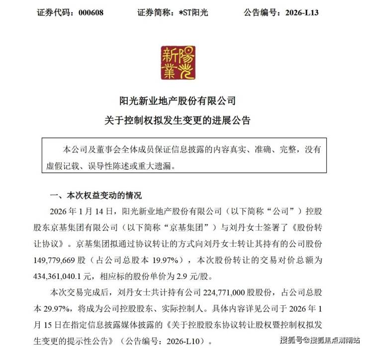 中房网讯 (苏晓/文)1 月 27 日,ST阳光发布控制权拟变更进展公告,宣告深圳地产巨头京基集团对其近六年的掌控正式落幕,交易完成后京基集团将清仓退出ST阳光,其在 A股控股的上市公司仅剩京基智农。
