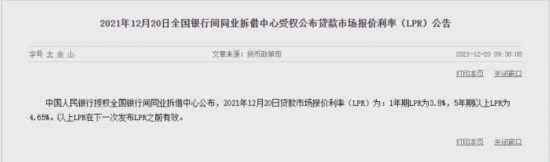 时隔20个月,LPR再现下降。中国人民银行授权全国银行间同业拆借中心公布,2021年12月20日贷款市场报价利率(LPR)为:1年期LPR为3.8%,5年期以上LPR为4.65%。