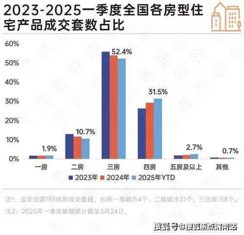 CRIC数据显示,2025年一季度,新房需求继续由二房、三房向四房迁移,前两者的成交套数占比较去年水平分别下降1.1和1.7个百分点,而四房产品同期增加2.1个百分点,市场份额首次提升至三成以上水平。