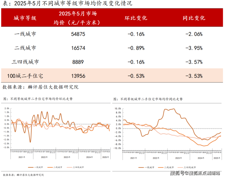 报告显示,5月一线城市二手房市场均价为54875元/平方米,环比下跌0.16%,同比下跌2.06%;二线城市市场均价为16574元/平方米,环比下跌0.89%,同比下跌3.95%;三四线城市市场均价为8889元/平方米,环同比分别下跌0.16%、3.57%。