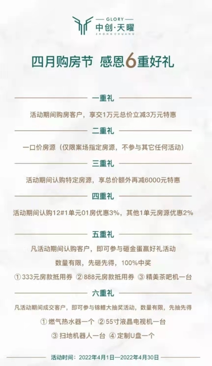 而位于高新区敬贤大街与新盛二路十字的中创·天曜项目四月购房节,感恩6重好礼,购房享交1万元总价立减3万元特惠。 项目在售2#、10#、12#楼,建面约108㎡、117㎡、125㎡。预计2023年10月20日交房。