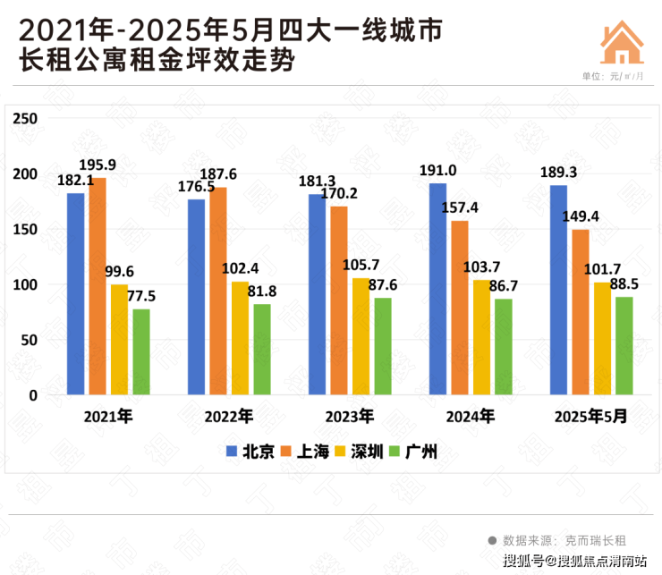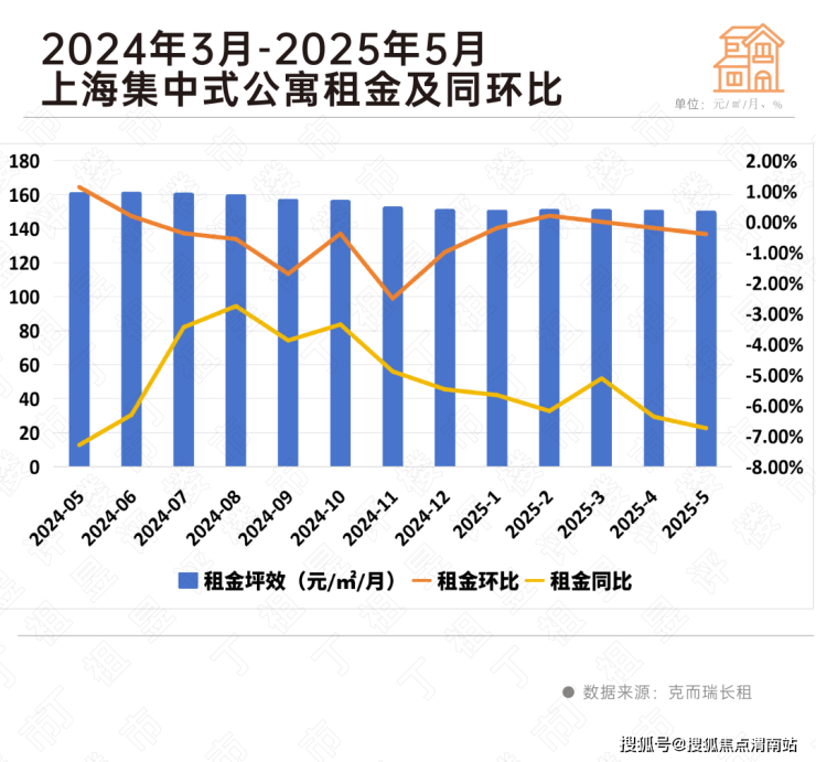 克而瑞长租数据显示,广州是唯一租金微涨的城市,较2024年上涨2.08%;北京、上海和深圳集中式长租公寓租金出现1-5%的降幅,尤为典型的是上海,今年5月租金坪效较2024年下跌超5%。