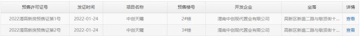 位于渭南高新区的中创·天曜项目2#、3#楼在2022.1.24取得预售证。
