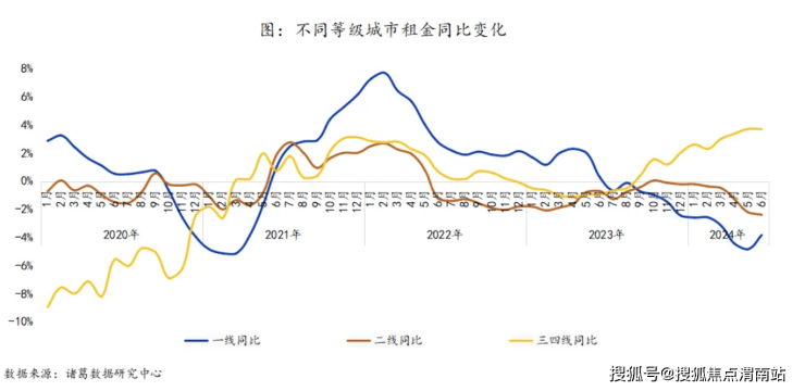 从供给端来看,重点一、二线城市在租房源水平仍然高于去年同期,房源竞争仍存,这或许也是租金同比走势持续较弱的原因之一。诸葛找房数据研究中心统计的数据显示,2024年6月一线城市在租量同比上涨10.25%,二线城市同比上涨11.25%。截至今年6月,一、二线城市在租房源量同比已分别连续18个月、11个月呈现正增长。