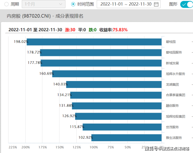 其中A股方面,中交地产股价在11月23日至12月1日期间走出“7连板”走势,中国武夷在11月24日至12月2日期间走出“6连板”行情;港股方面,碧桂园股价在11月1日创下1.0港元的新低后,随后便开启上涨行情,11月累计上涨198%;龙湖集团、合景泰富11月的累计涨幅均超130%。